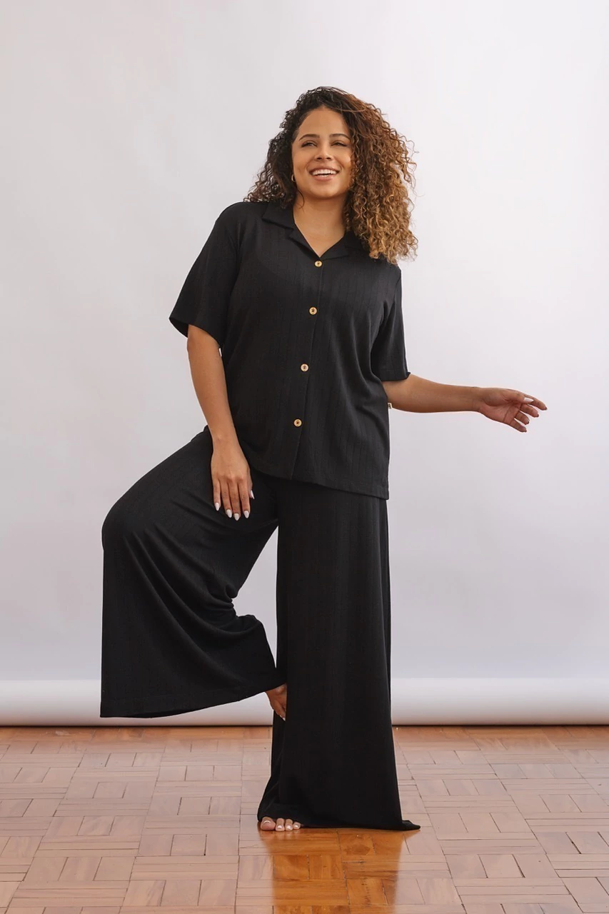 Feita com um tecido de toque suave e respirável, esta camisa apresenta uma estrutura única com efeito crepe canelado, composta de viscose e elastano. Esse acabamento garante um caimento fluido e flexível, acompanhando elegantemente os movimentos do corpo.